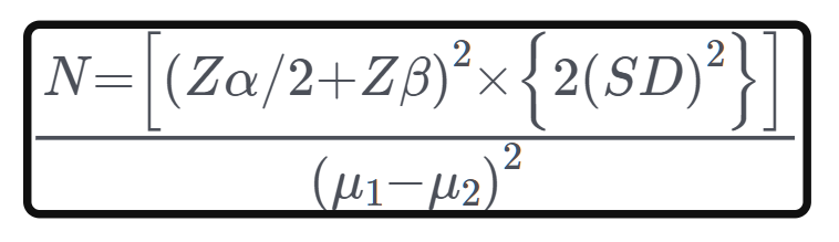 In this formula, N=Sample size in each group, µ1=mean change in group 1or mean score at baseline, µ2=mean change in group 2 or mean score after intervention, µ1-µ2=clinically significant difference, SD=standard deviation, Zα/2=This depends on the level of significance (for 5%=1.96), Zβ =This depends on power (for 80%=0.84).